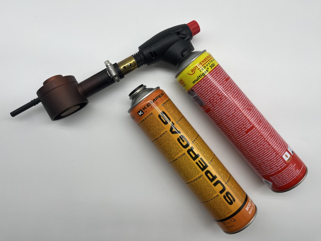 - Zuerst wird der Gasbrenner auf die Gaskartusche geschraubt, dann wird der Sublimator auf den Brenner gesetzt und mit Hilfe der