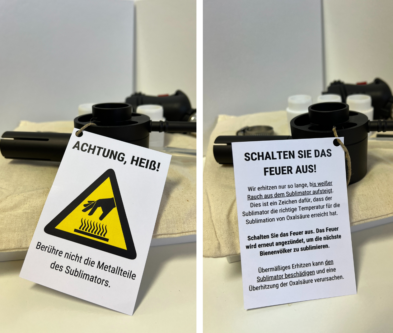 - Wiederholung: Für die nächste Bienenkolonie setzen Sie eine neue Kappe mit der erforderlichen Dosis Oxalsäure ein. Zünden Sie die Flamme erneut an und erhitzen Sie den Sublimator, bis wieder Rauch austritt. Dies zeigt, dass der Sublimator die richtige Temperatur erreicht hat. Danach löschen Sie die Flamme.