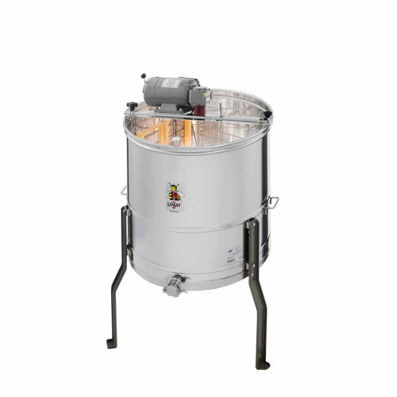 4-Waben Honigschleuder, Universal, mit Motorantrieb 110 W / 230 V und einem integrierten Sicherheitsschalter, welcher den Motor bei Deckelöffnung automatisch abschaltet. Modernste Technik ermöglicht uns eine innovative Ausarbeitung des Honigschleuderbodens. Der Boden des Kessels ist nahtlos geschweißt und Richtung Auslauf geneigt. Der rostfreie Quetschhahn ist am tiefst möglichen Punkt angeschweißt, damit der gesamte Honig aus der Honigschleuder abfließen kann.