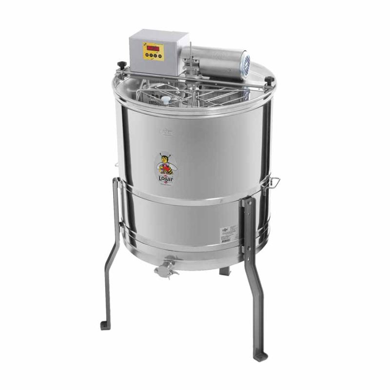 Innovative Selbstwende-Honigschleuder mit Doppeltaschen – entwickelt, um viele niedrige Waben auf kleinem Kesseldurchmesser effizient zu schleudern. Die 8-Waben Selbstwendeschleuder mit Motorantrieb (110 W / 230 V) verfügt über eine vollautomatische Steuerung und einen Sicherheitsschalter, der den Motor beim Öffnen des Deckels sofort abschaltet. Die doppelseitigen Wabentaschen sind durch ein Blech getrennt, über das der Honig abfließt. Modernste Technik und ein nahtlos geschweißter, zum Auslauf geneigter Kesselboden ermöglichen einen vollständigen Honigabfluss. Der rostfreie Quetschhahn ist am tiefstmöglichen Punkt angeschweißt, damit der gesamte Honig entnommen werden kann. Alle honigberührenden Teile bestehen aus lebensmittelzugelassenen Materialien. Der Deckel besteht aus durchsichtigem Acrylglas, und die speziell konstruierten Standfüße gewährleisten stabile Standsicherheit.